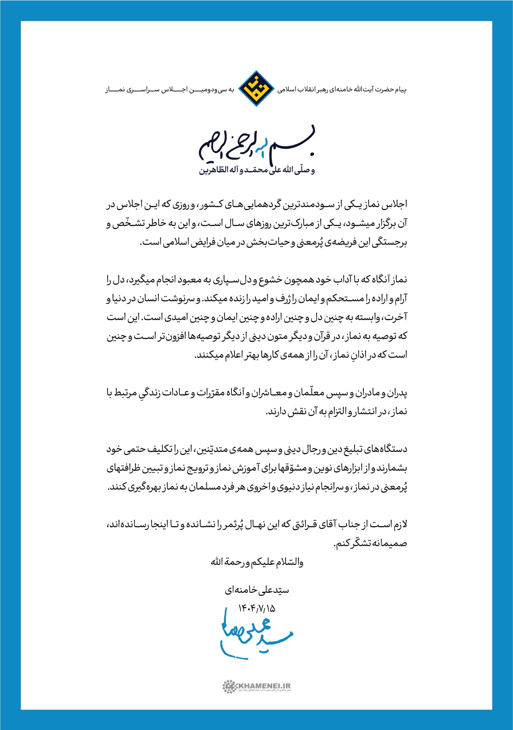 پیام رهبر انقلاب اسلامی به سیودومین اجلاس سراسری نماز