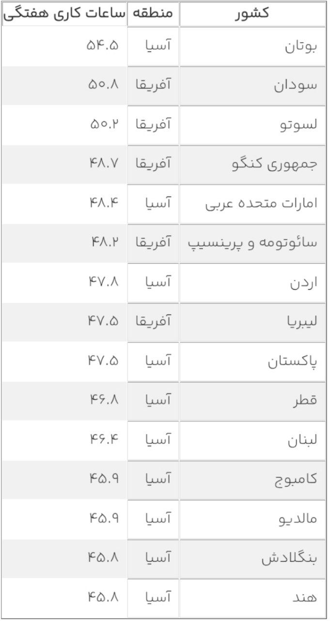 ایران با ۴۳.۲ ساعت میانگین ساعات کاری هفتگی، در رتبه ۳۸ این فهرست قرار دارد.